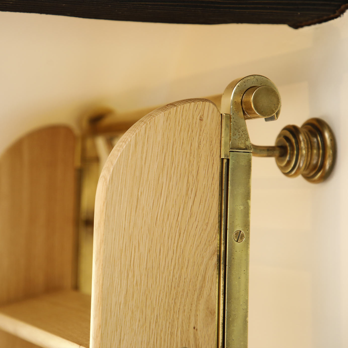 In order to create the varying height options, the sliding hooks were designed to allow the ladder to extend to the maximum height and retract to the shortest for stowing in the cupboard, so the length of the beautiful European oak timber we used had to be cut at the shortest length required, with the antique brass hooks taking up the gap. This combination of European oak and aged brass rails and fixings fit seamlessly into our client’s overall interior scheme.