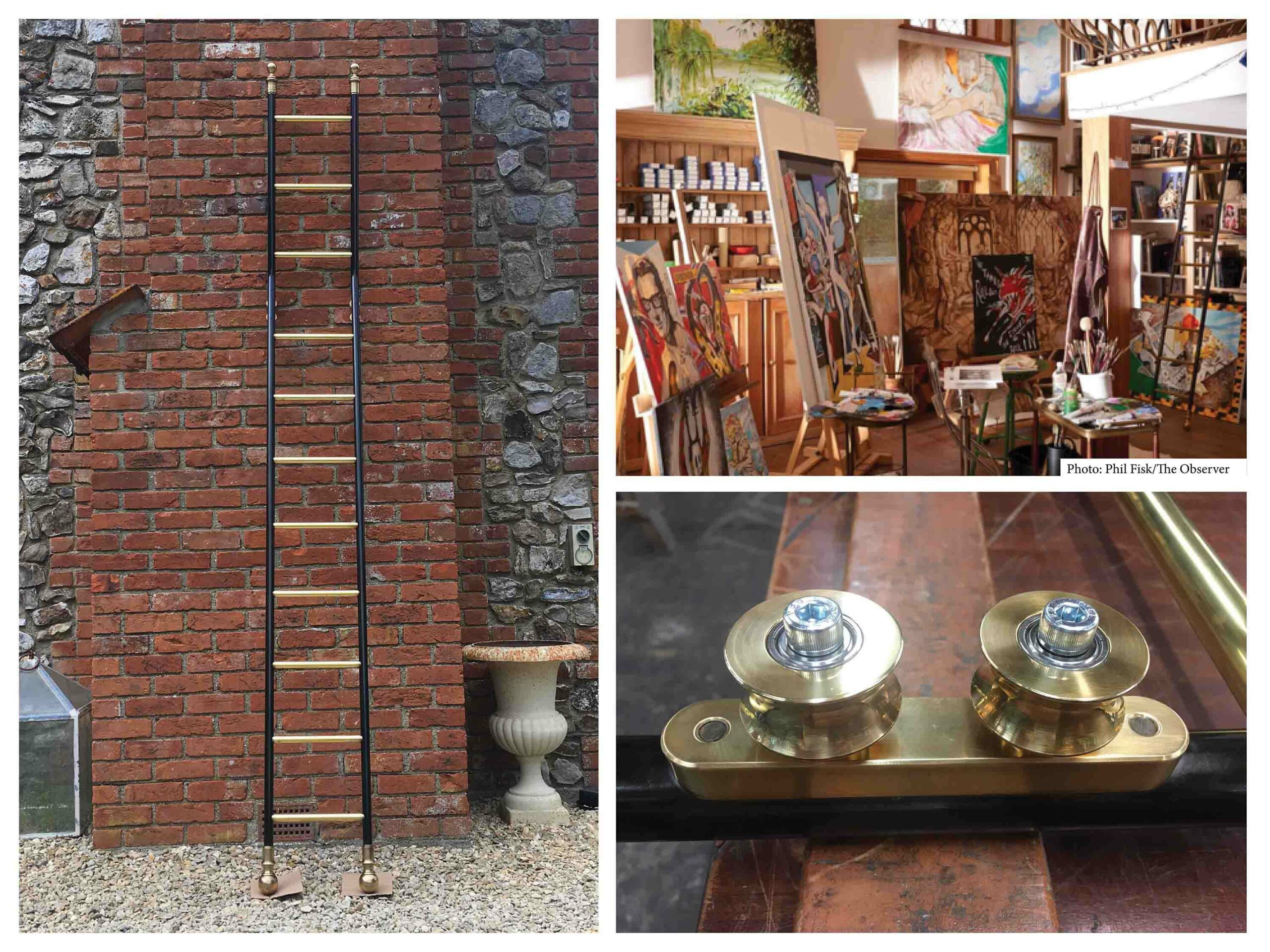 The classic ladder design was an elegant addition to this well-established outfitter. The steel stringers and ladder rail were hand patinated in a gun-barrel (blackened) finish, with the brass components (the rungs, feet, end caps, carriages and rail fixings) in a wonderfully contrasting antique finish.