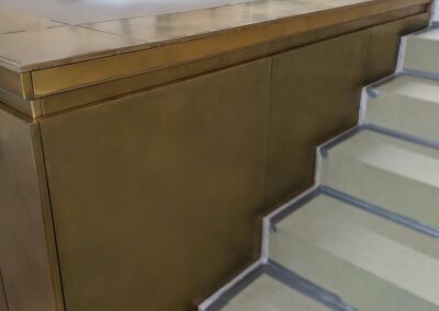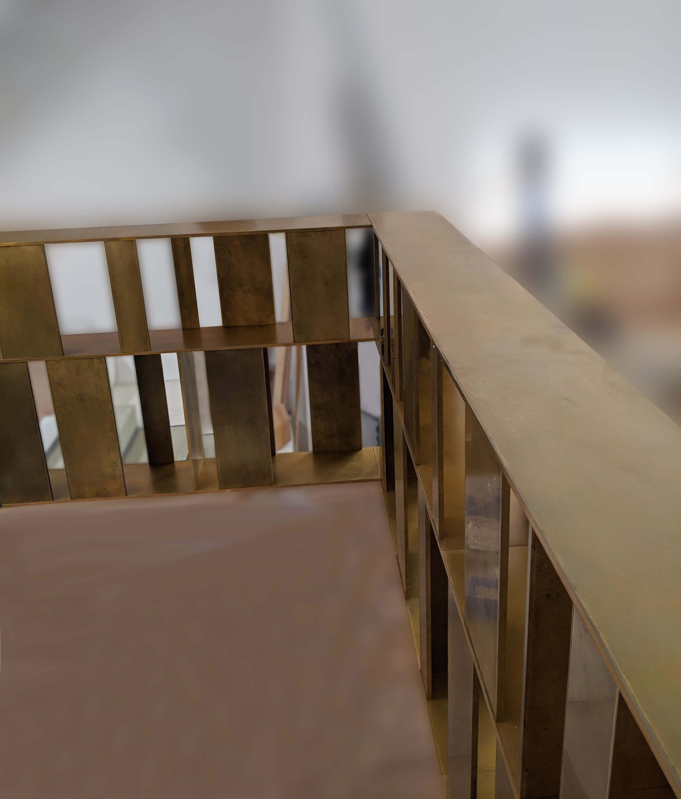 This was a challenging, and incredibly interesting project. We really did love the concept of developing a bookcase balustrade. It perfectly acts as a ‘railing’ to the upper level of the basement room, but one that is highly functional as a room divider with storage. The overall result was attention-grabbing – a real statement piece – with the panels and shadow gaps on the stairway creating depth and interest to the surface of the hand-patinated, antiqued brass.