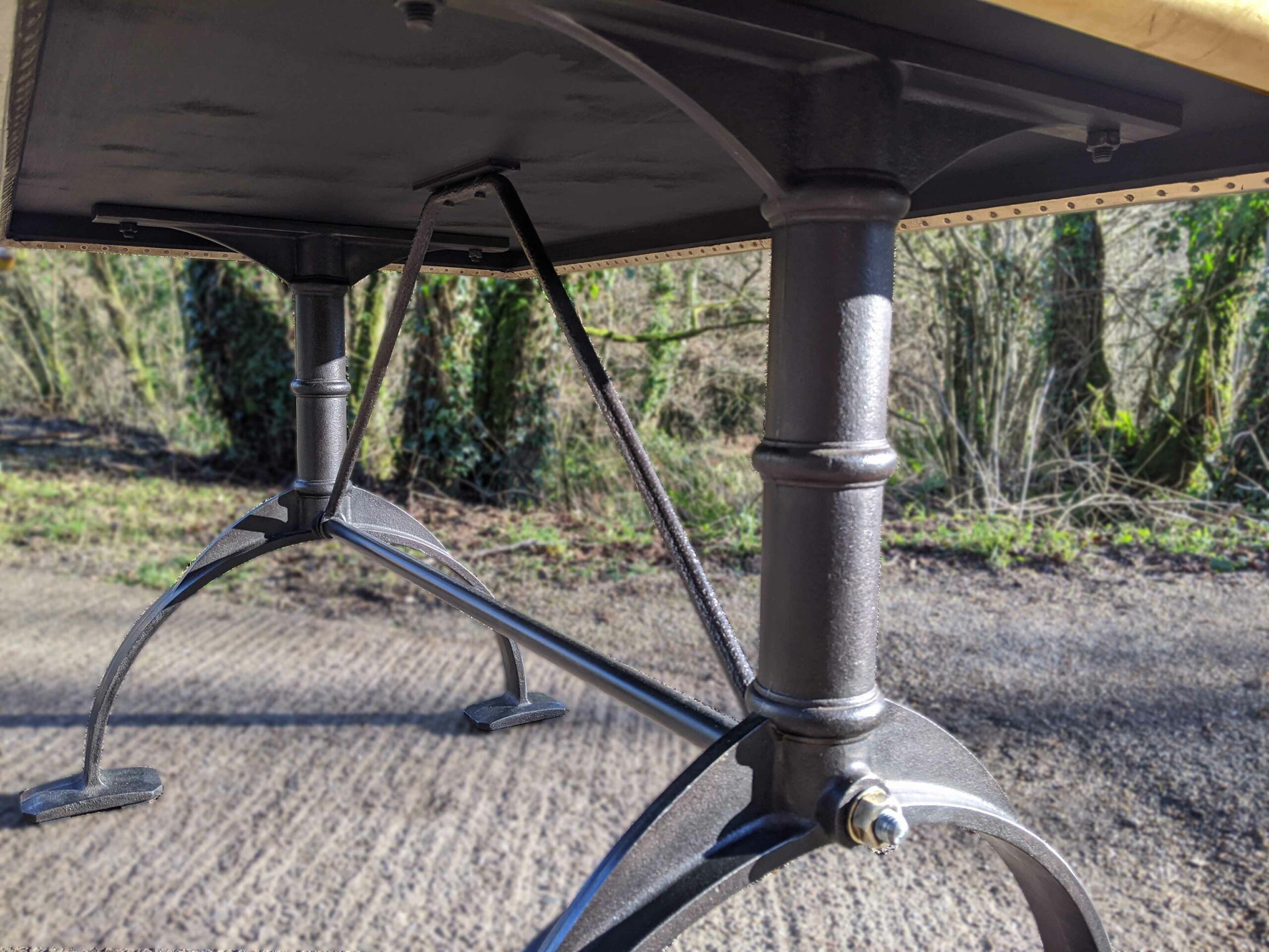 Measuring 1.4m in length (our standard tables measure between 1.8m and 2.3m) and with cast iron bases, this bespoke dining table was hand wrapped in sheet brass, and shaped to create the bull-nose edges. These soft sweeping curves are achieved by cutting the copper precisely at the corners, then forming and soldering them together (a little bit like segments of an orange) to create beautifully wrapped curved edges and corners. Hand-swaged joints are incorporated to form the unique body of the table top. (We joint the top to reduce the visible effects of expansion of the metal caused by temperature changes within the room.) The patinated finish is bespoke, creating its own engaging and individual personality.