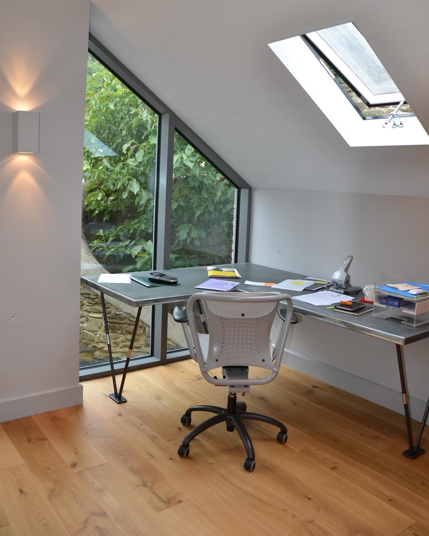 The brief called for a series of bespoke desks that would sit comfortably within the architectural style of the property and provide generous, well-proportioned workspaces. As with all our commissions, the bespoke design process began with a detailed discussion regarding layout, proportions and intended use. Once we had explored the spatial requirements and the client’s preferred materials, the direction became clear. The design would centre around our antique patinated zinc, a finish that offers both character and durability, paired with a structural element that expressed the industrial theme with subtlety and sophistication.