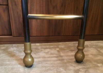 The final solution provided two rolling gun barrel steel and antique brass library ladder solutions, one of which needed to enable the user to be able to position the ladder vertically when not in use. The solution provided for this dressing room incorporated a ladder which both rolled smoothly from left to right, but also retracted, vertically, against the wardrobes – maximising the floor space within the room. Equally, this particular room had a restricted amount of space for the ladder to extend, when in use. (We would normally construct any ladder solution to observe the ‘Four in One‘ rule, however the restricted floor space meant this could not happen.) This was a truly made-to-measure library ladder solution!