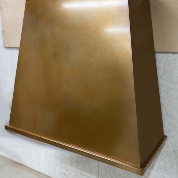 The cooker hood is formed with a substrate frame, giving its shape and structure, and is wrapped in flat copper sheet, with solid brass flat trims to the top and bottom.